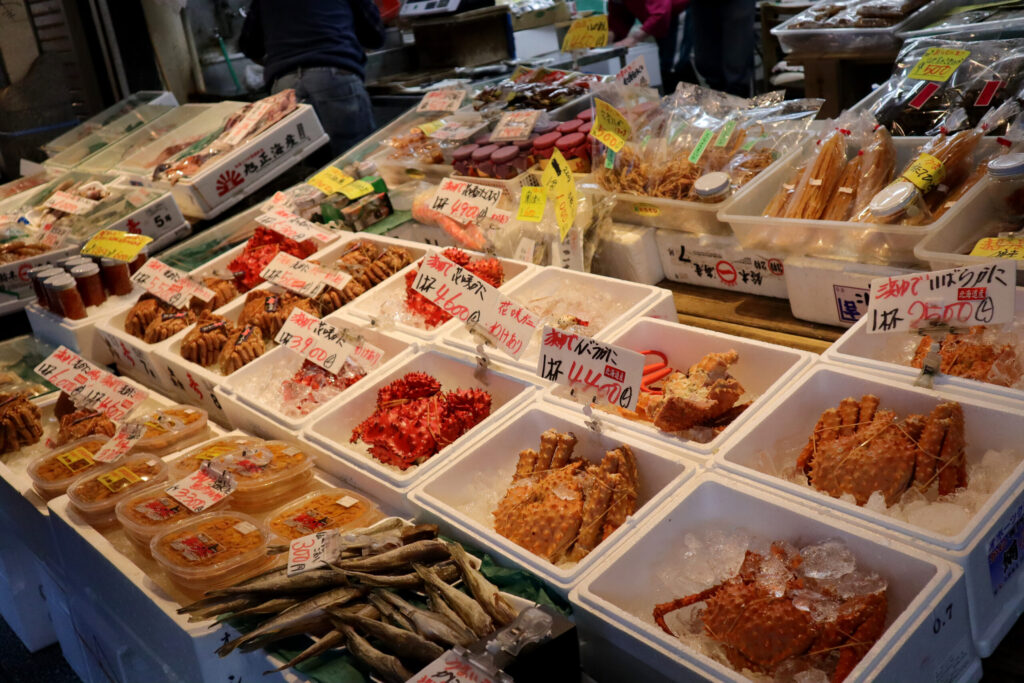 Morning markets in Otaru sell live crab and fresh shellfish. Many stalls offer a “buy and eat” style: you choose your crab or scallops, and they cook them on the spot.