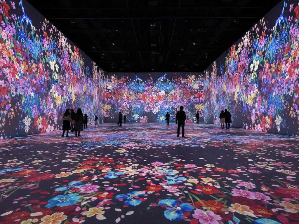 - Large-scale immersive museums feature interconnected rooms of digital waterfalls, floating lanterns, flower fields, and interactive corridors. Artwork may drift from room to room, reinforcing the idea of a “borderless” world.