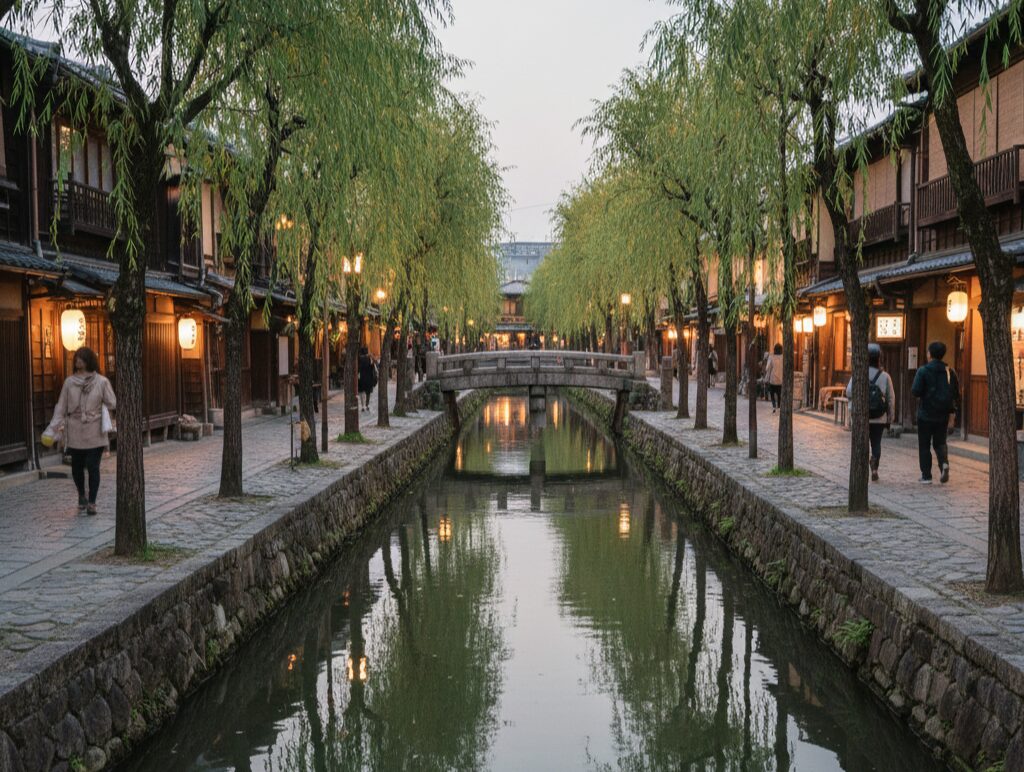 North of Shijo-dori, the Shirakawa area runs alongside a willow-lined canal crossed by stone bridges. It is one of the most romantic and atmospheric spots in Kyoto, especially at night when traditional restaurants and teahouses cast soft reflections on the water.