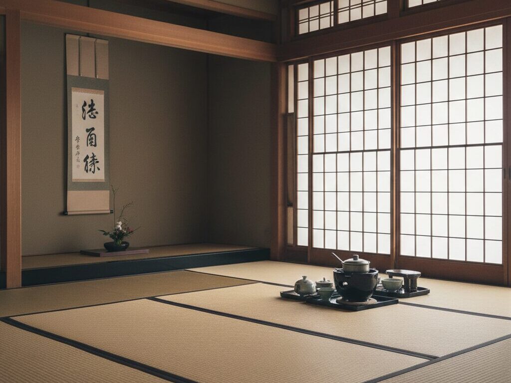 Inside, you will enter a tearoom with tatami mats. The room’s decoration is simple: perhaps a hanging scroll, a flower arrangement, and the tea utensils arranged near the hearth or portable brazier. Each element is chosen to reflect the season or theme of the day.