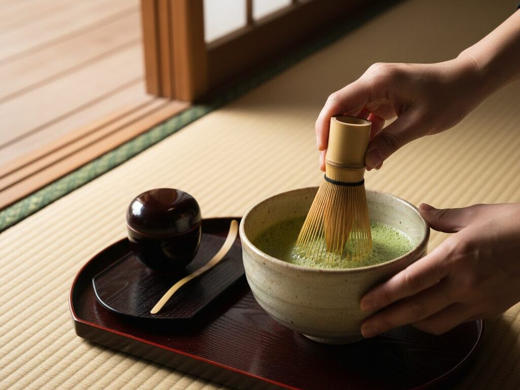 Then the host measures a portion of matcha into the bowl, adds hot water, and whisks it with the bamboo whisk until a fine foam forms. The sound of whisking, the aroma of tea, and the soft light in the room combine to create a quiet, immersive atmosphere.