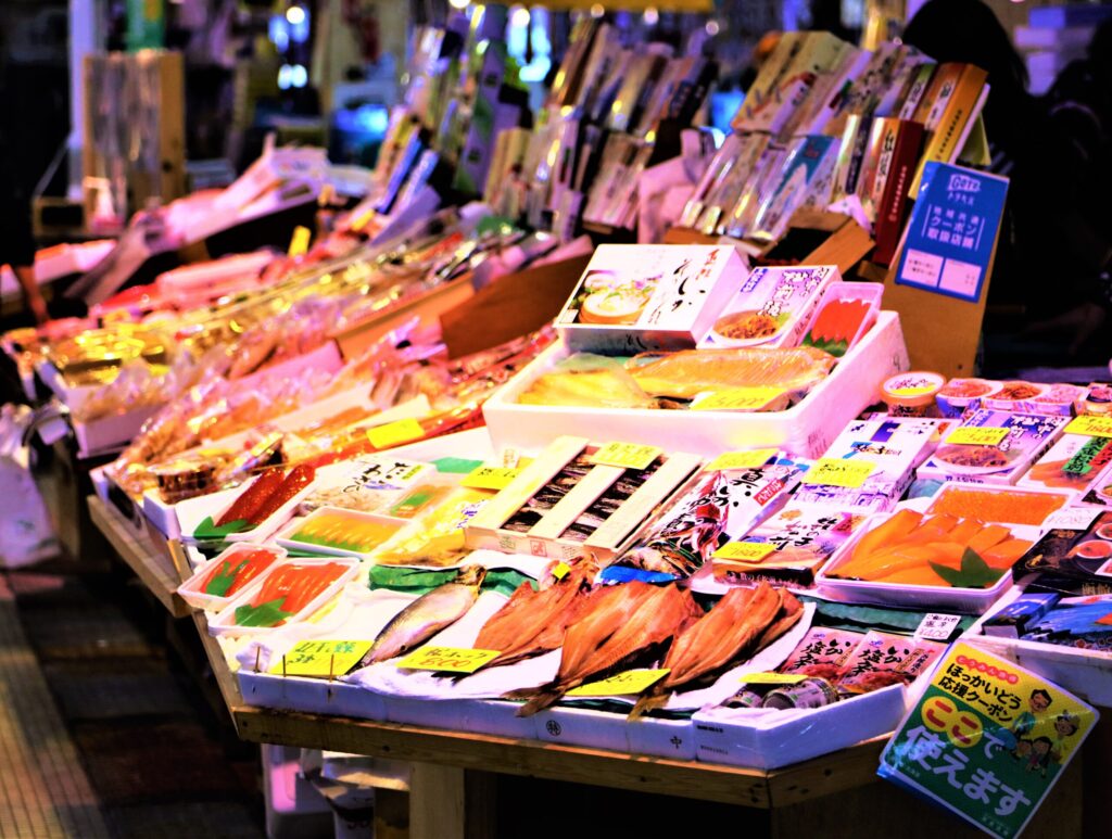 - Seafood stalls selling fresh crab, squid, salmon roe, sea urchin, scallops, and seasonal fish.