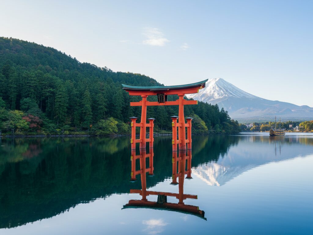 • Lake Ashi (Ashinoko): A scenic crater lake where sightseeing boats, often styled like pirate ships, cruise between ports. On clear days, Mount Fuji rises behind the torii gate of Hakone Shrine.