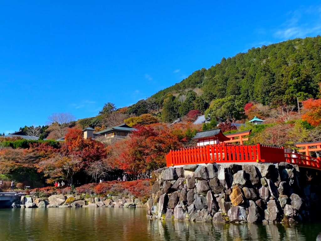 Katsuoji is one of the region’s most beloved spots for autumn foliage. From mid-November to early December (timing varies slightly each year), the gardens transform as hundreds of maple trees ignite in shades of crimson, orange, and gold. Reflections in the ponds and the contrast with red temple buildings make this a paradise for photographers.