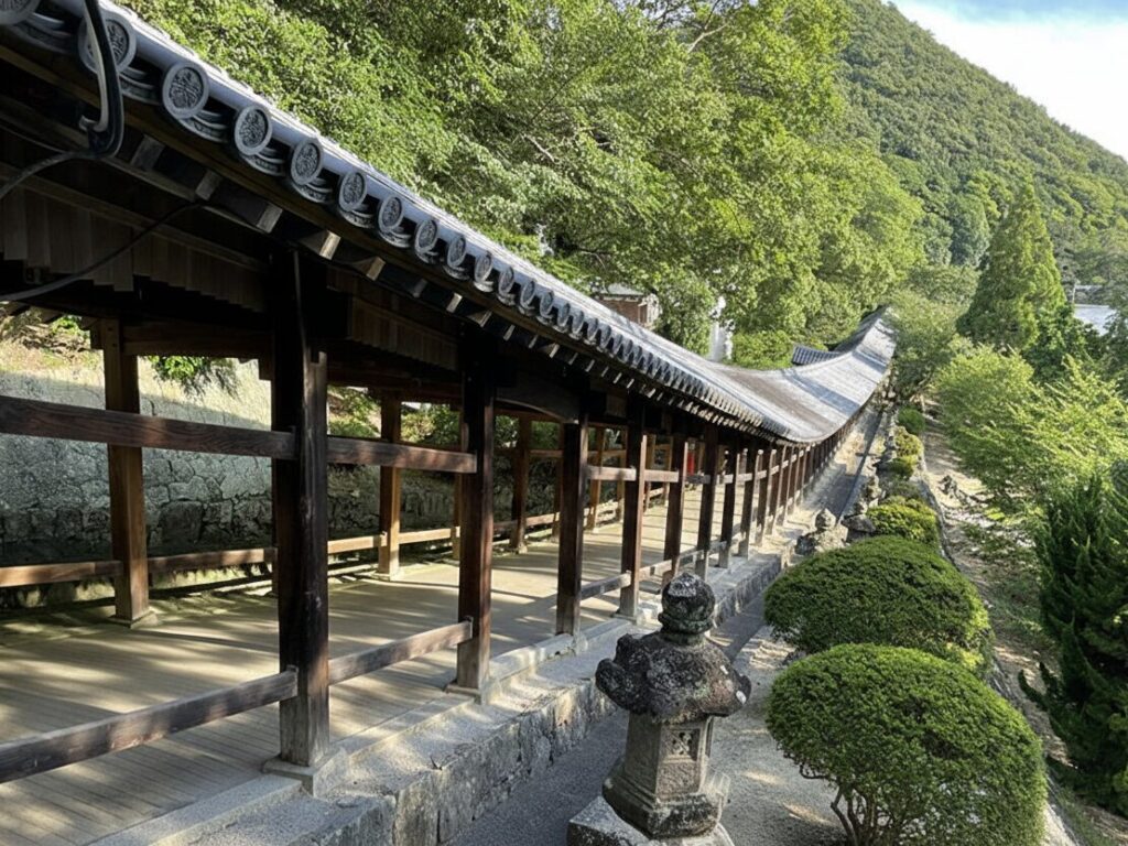 One of Kibitsu Shrine’s most striking features is its long covered corridor that stretches nearly 400 meters up the hillside. Built in the Edo period, the gently sloping walkway connects the main shrine area with subsidiary shrines and overlooks the surrounding countryside.