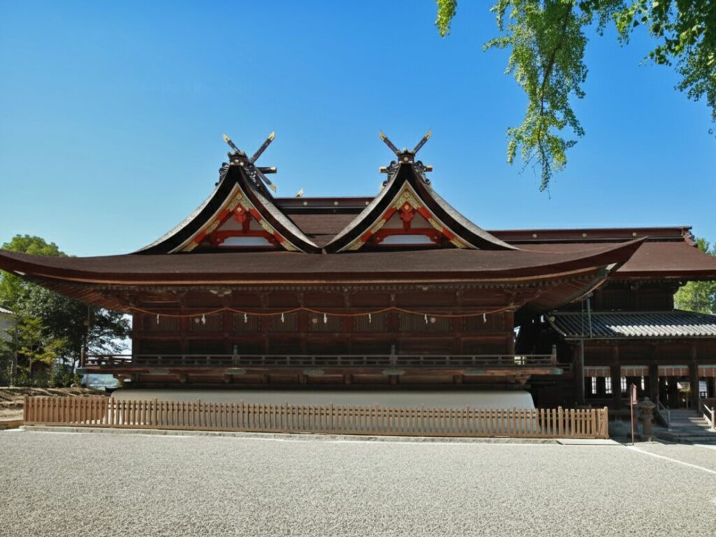 Kibitsu Shrine’s main sanctuary is celebrated for its rare hiyoku irimoya-zukuri style — literally “paired gabled roof.” Instead of a single roof over the worship hall and inner sanctuary, the structure features two adjoining gabled roofs of equal height, creating a grand, double-roof silhouette when viewed from the side.
