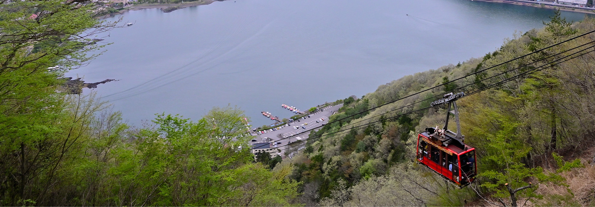 The Mt. Fuji Panoramic Ropeway is a cable car system on the eastern shore of Lake Kawaguchi (Kawaguchiko), part of the Fuji Five Lakes region at the northern foot of Mt. Fuji. In just a few minutes, the ropeway carries you from lake level to an observation area on Mount Tenjo, opening up a classic view of Mt. Fuji rising above the water and surrounding hills.