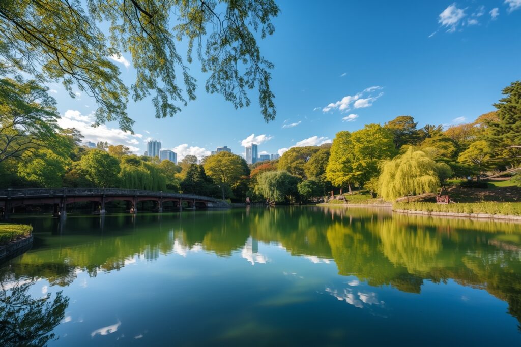 The result feels like a cross between a European city park and a Japanese strolling garden: wide, flat walking paths and lawns alongside stone lanterns, vermilion bridges, and carefully framed views of water and greenery. It’s a favorite spot for locals to jog, walk dogs, take children to the playground, or simply sit on a bench and watch the reflections on the lake.