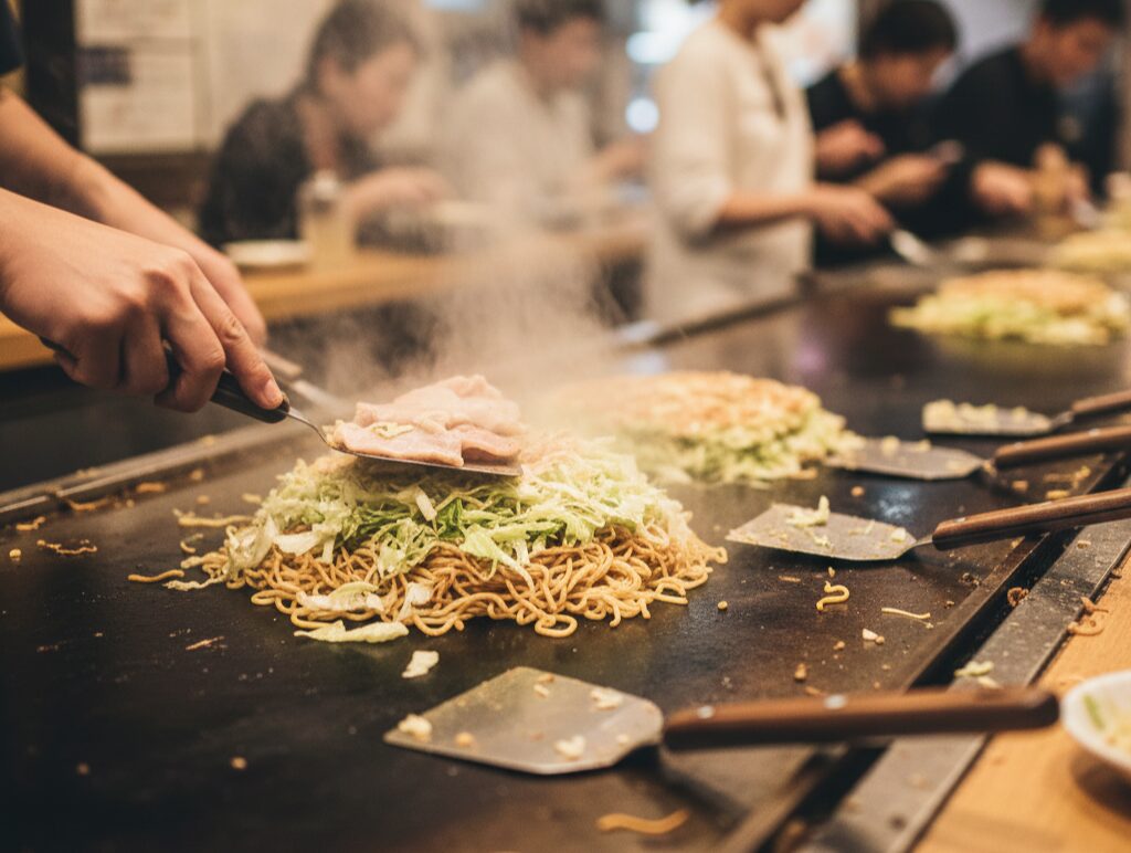 Expect a mix of locals, Japanese tourists, and international visitors, especially in the evenings. The mood is friendly and energetic: the sound of spatulas clattering, noodles frying, and the hiss of cabbage hitting the hot iron creates a cozy soundtrack.