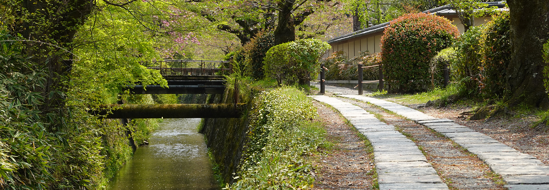 The Philosopher’s Path is a pedestrian walkway of roughly 2 km (a little over a mile) in Kyoto’s Higashiyama district. The route traces an old irrigation canal, originally built during the Meiji era to bring water from Lake Biwa into Kyoto. Today, it connects several small shrines and temples, artists’ studios, cafés, and traditional houses.