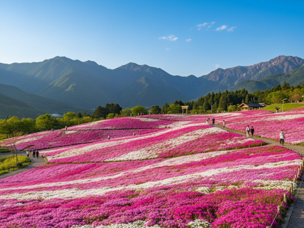 In spring, places like Hitsujiyama Park are carpeted in pink moss phlox (shibazakura), drawing visitors to its bright, patterned flower beds set against mountain backdrops.