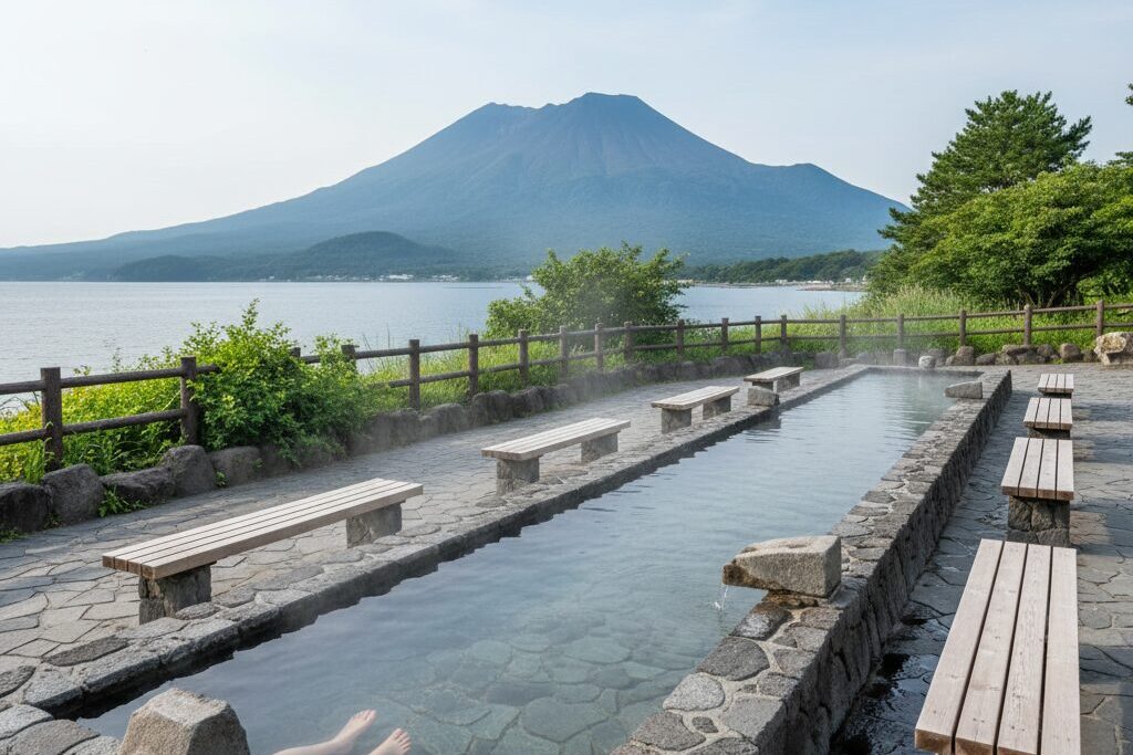 Hot springs, or onsen, are central to Japanese relaxation culture, and Sakurajima offers a very accessible version: outdoor footbaths, known as ashiyu. You soak only your feet and calves, so there is no need to undress.