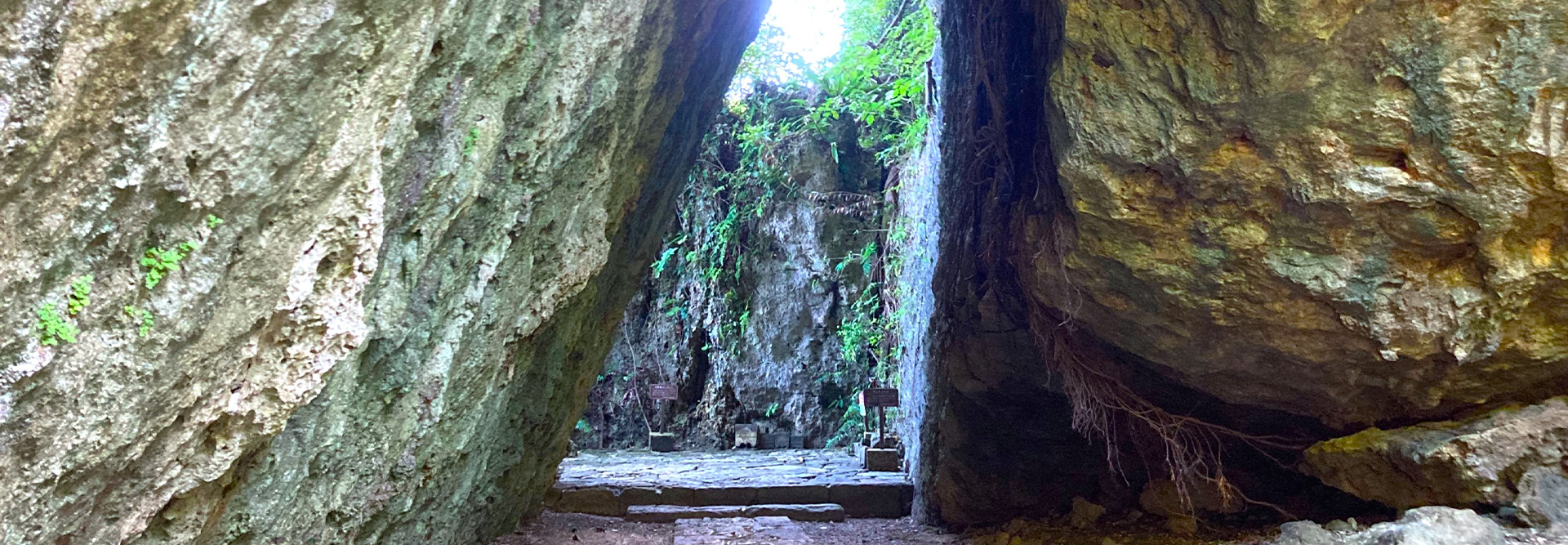 Instead of a grand gate and wooden shrine hall, Sefa Utaki is made of natural formations: forests, rocks, caves and dripping stalactites. Paths wind through dense greenery, and the “altars” are simple stone platforms, low walls, or springs of water where offerings were once made. The natural setting is central to its spiritual power, and this is why the entire area is protected.