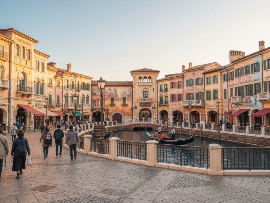 This is the entrance area, styled like an Italian seaside town with canals, piazzas, and the deluxe Tokyo DisneySea Hotel MiraCosta built right into the skyline. It is home to Venetian gondolas, waterfront shows, and many shops and restaurants.